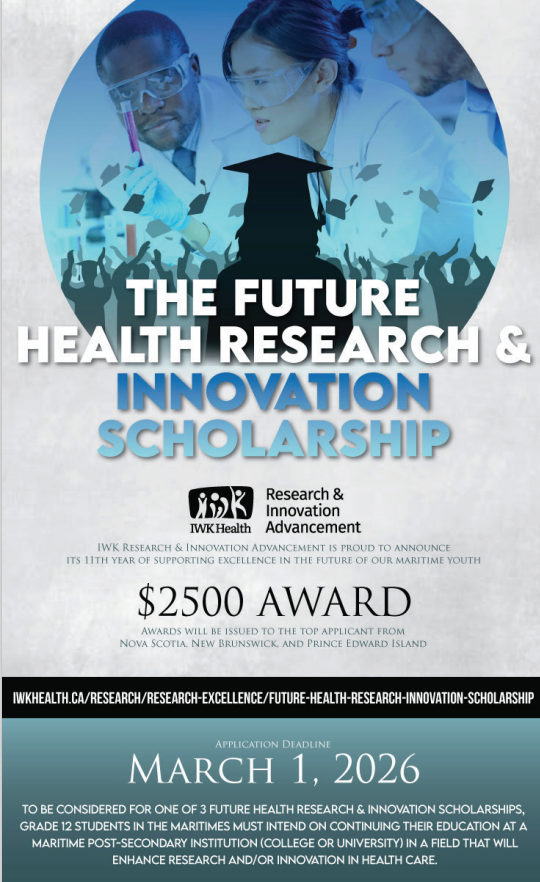 To be considered for one of three Future Health Research and Innovation Scholarships valued at $2500, grade 12 students in the Maritimes must intend on continuing their education at a Maritime post-secondary institution (college or university) in a field that will enhance research and/or innovation in health care.