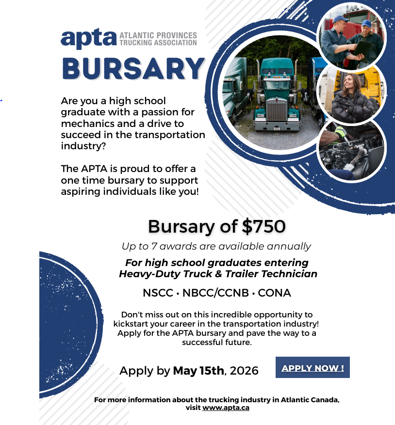 Atlantic Provinces Trucking Association Bursary 17 March 2026 Filed in: 🎒 Current Students Guidance and Post-Secondary Published March 17, 2026 Last modified March 17, 2026, 1:12 pm